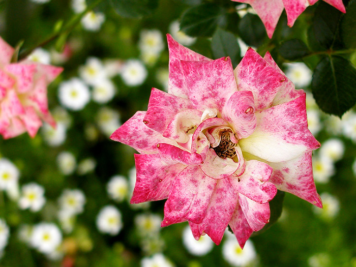 背景にはバラの葉などの緑色の中に、小さな白い花がやわらかくボケて沢山写っています。