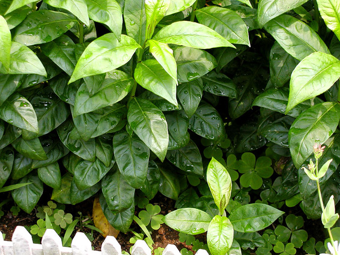 影になった葉や奥にある葉には雨粒が残っています。光が反射しています。