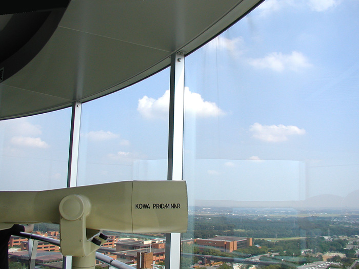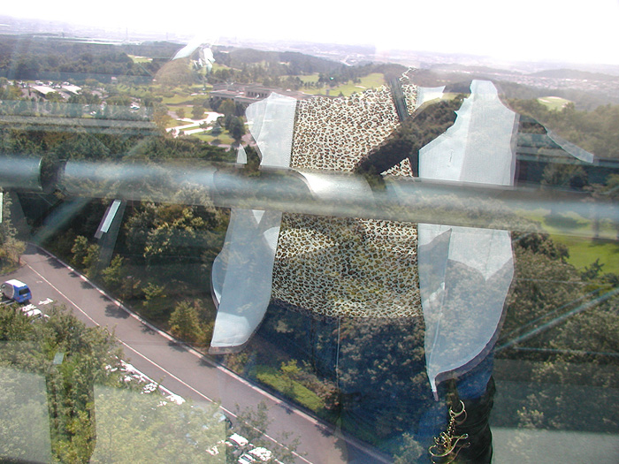 東松山にある平和資料館の展望台はグルリとガラス張りになっていて、手前に手スリがついていました。 ガラス越しの撮影法を教わり、手スリ添いに歩きながらパチリパチリとやりました。 |